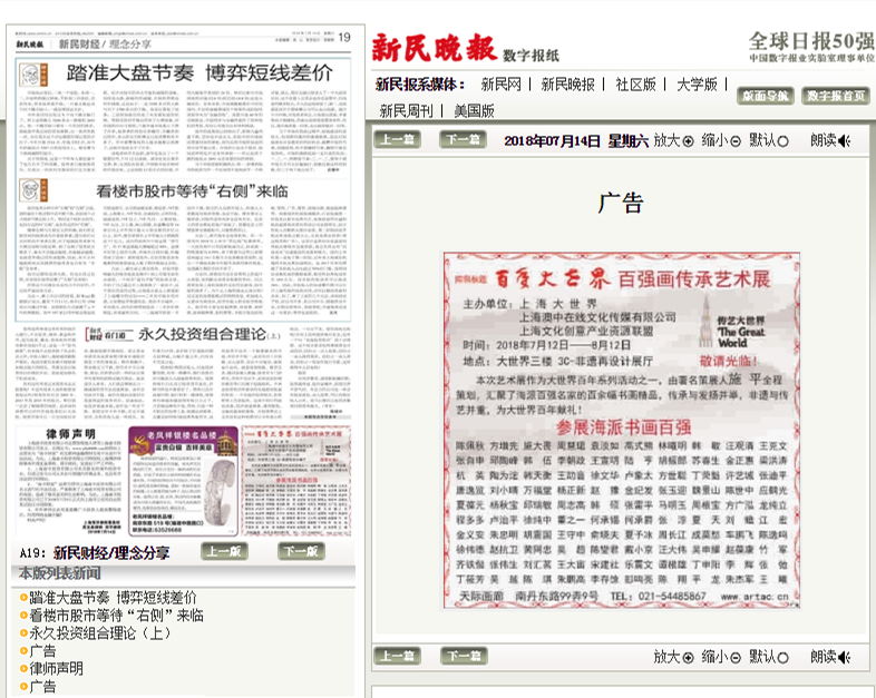 《新民晚报》刊登“百年大世界百强画传承”艺术展消息