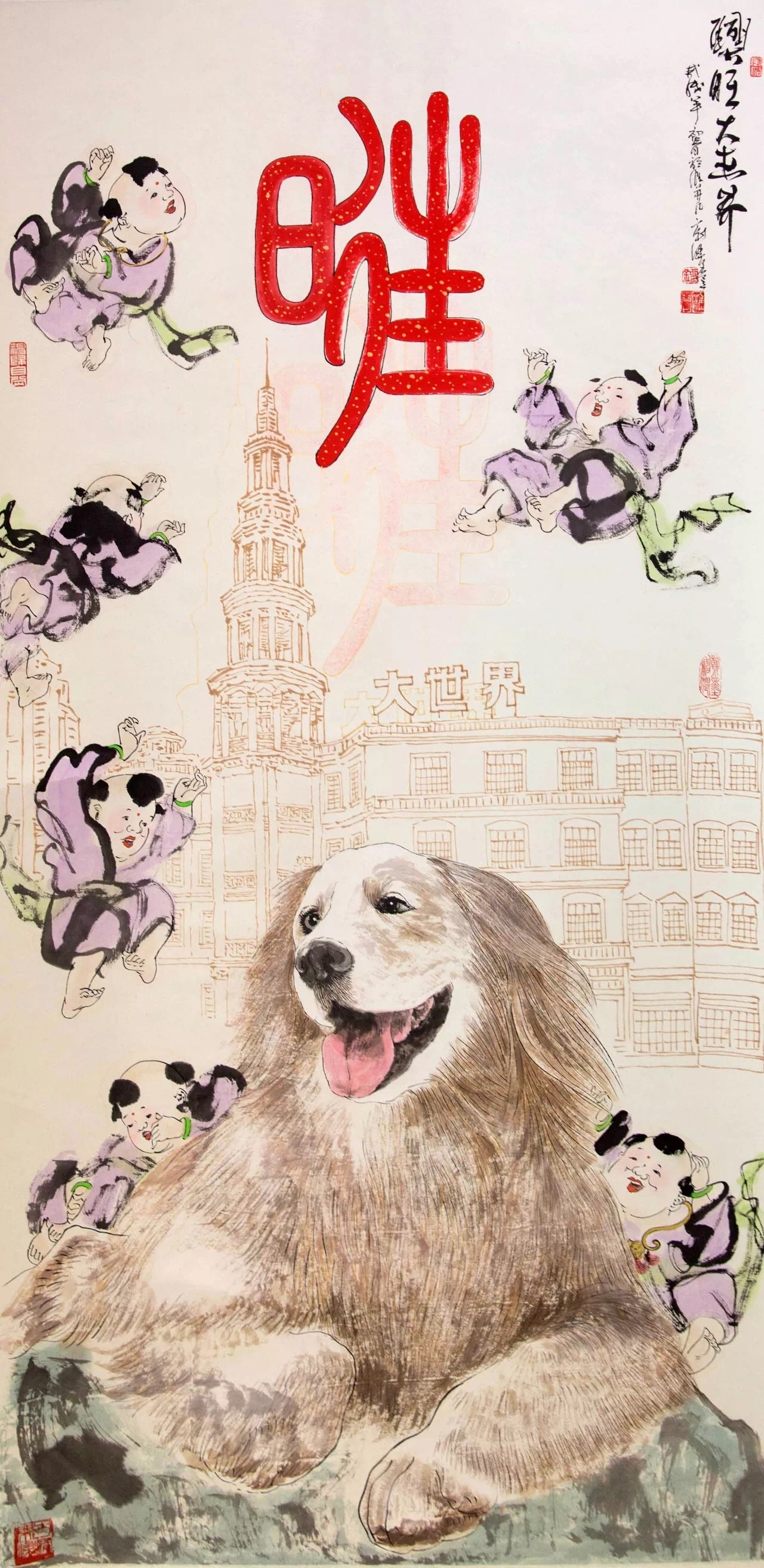 海派百强名家刘汇茗年少时曾在大世界(原名上海青年宫)学习,正值是青春焕发、风华正茂的年代,他的绘画事业由此而启航!如今,他带着艺术作品《兴旺大世界》回归,以戊戌年生肖狗为主体,白描大世界为背景,辅以六个欢乐的孩童,并题上“旺”字,祝福大世界兴旺发达,大展宏图!