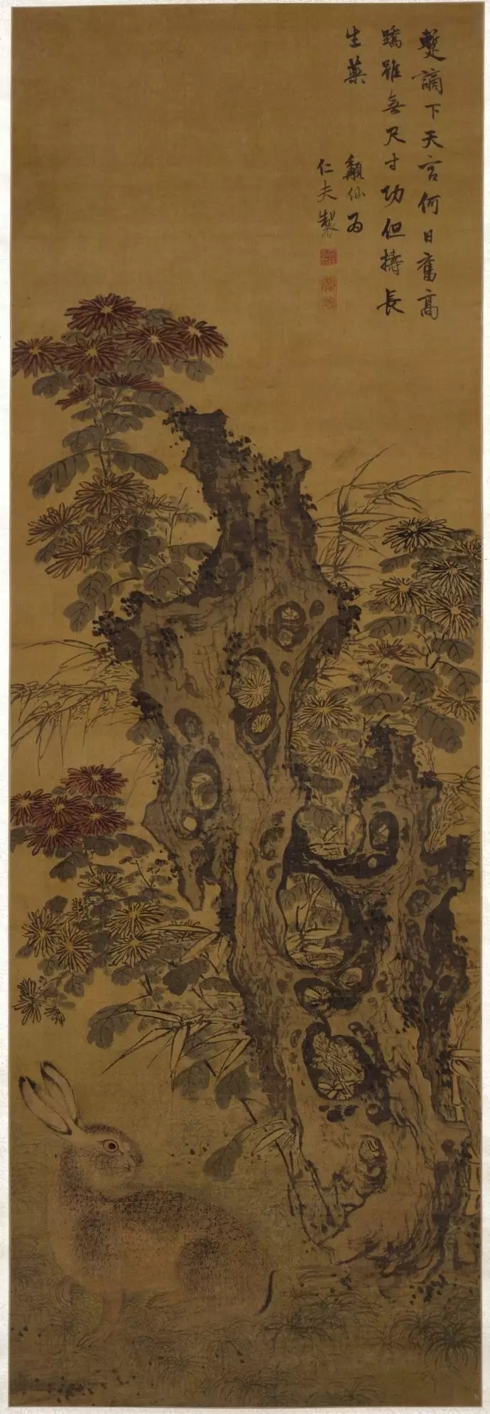 明 徐霖(1462~1538)《菊石野兔图》绢本设色 160×52厘米 故宫博物院藏