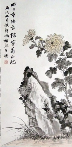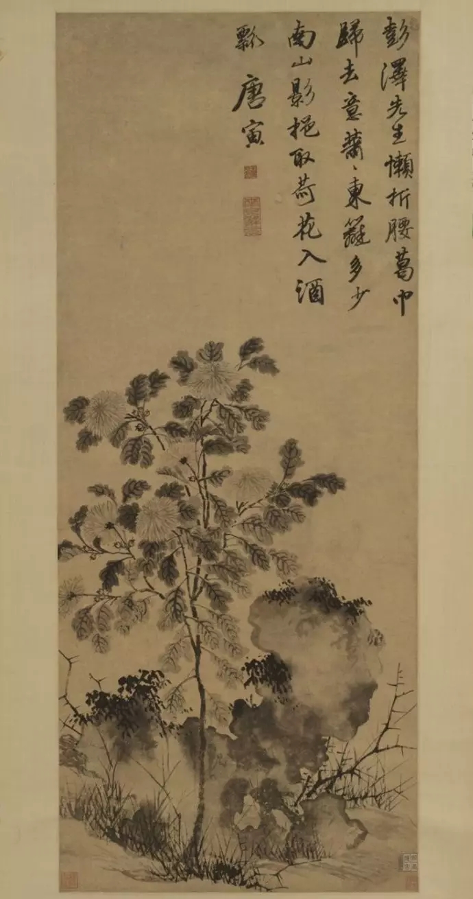 明 唐寅(1470~1523)《菊花图》纸本墨笔 尺寸:画芯138×55.5厘米,外围297×75.1厘米天津博物馆藏