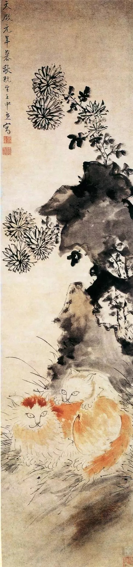 明 王中立(公元16-17世纪初)《双猫菊石图》立轴 纸本设色 133×32.5厘米 上海博物馆藏