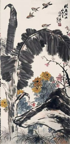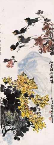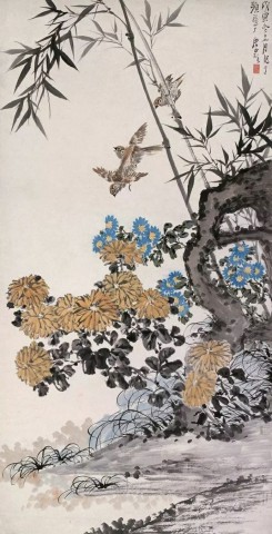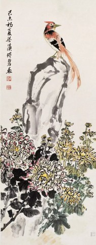 马晋(1900~1970)《秋菊梧桐鸟》纸本设色 97×50厘米北京画院藏