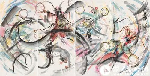 周根宝前往美国开拓艺术创作空间后,接触了西方经典绘画的各种表现方式,感悟到米罗超现实主义的跳跃式想象,并与抽象主义绘画先驱,音乐性绘画大师康定斯基的艺术精神产生了强烈的共鸣。不过周根宝并没有简单成为康氏的模仿者。我们知道,自从19世纪末印象派崛起以来,世界美术界开始了长达百余年的“为形式而形式”的艺术追求。从光影研究、主观造型,到狂野色彩、立体结构、超现实解构,乃至所谓装置、极简、行为、概念等等艺术理念……无不将对“形式”的发掘作为终极目标。然而,周根宝理性地摆脱了“形式风”,用自己千姿百态的笔墨神韵,表达他对真、善、美的思考,对精神世界的阐释!