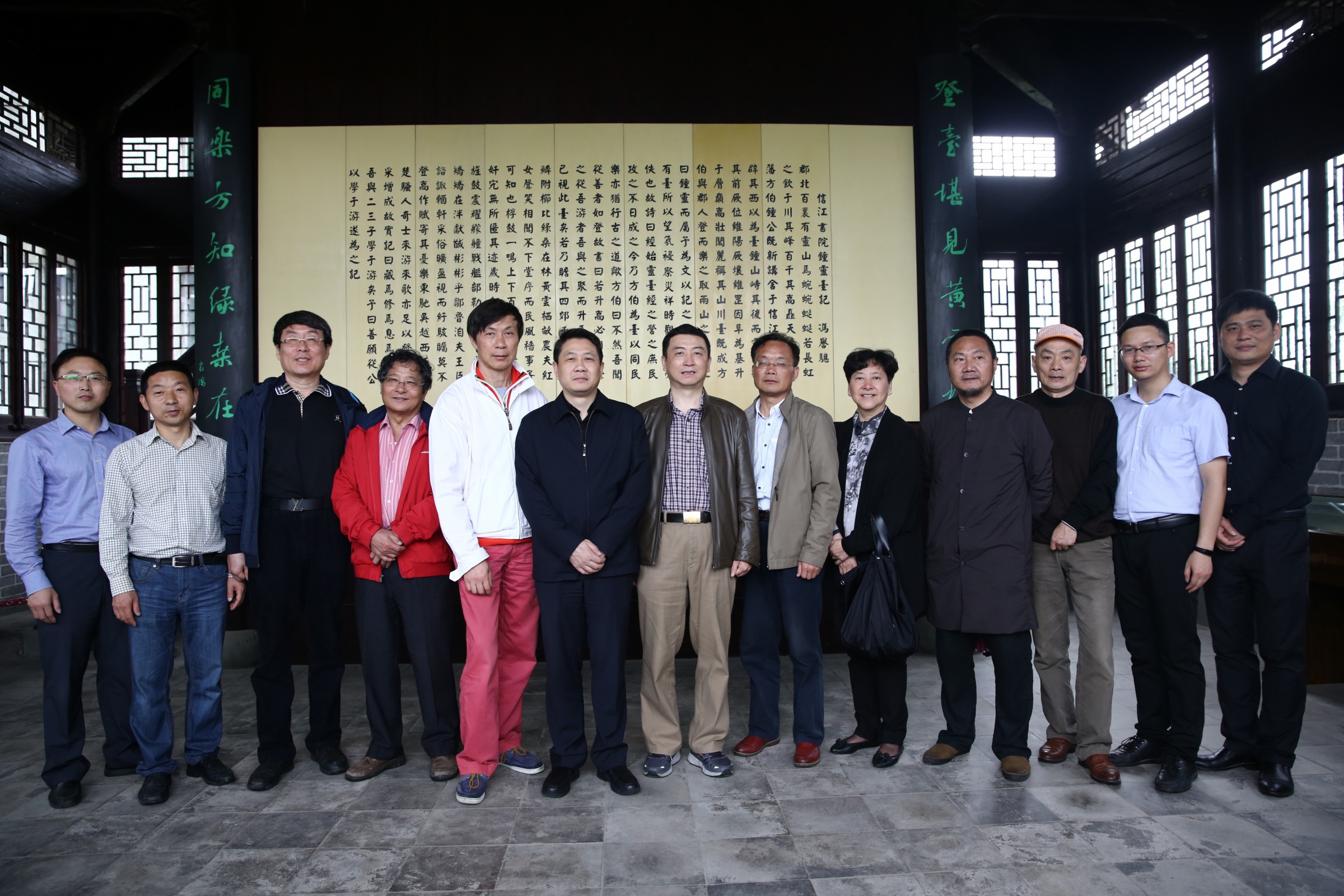 这次书协换届后,我们主席团即讨论通过了一个自律条例,其目的只是为自己设定一个底线。无论是领导或艺术家,或是一般的群众,底线思维非常重要。前阶段沸沸扬扬的有关书画家及其他一些热门艺术领域的传言,多少降低了当代艺术家协会领导的公信度,阻碍了协会工作的发展,这对于书法发展是极为不利的,我们这次换届又正是在这样一个时期进行的。虽然我只是一个普通群众,但作为一名中国书协理事和专业委员会的委员,应该担当起一些责任来自觉维护书法界的形象,况且主席团成员多少也是艺术名人,这就更需要以高尚的品格来要求自己,只有德艺双修者才能在书法界树立良好形象,才能带领大家做好工作。这与刻意表现自己无关,这的确也是我们主席团的愿望。公布了这些条例,其实也为自己树起了一面镜子,时刻照耀着自己的一言一行。 上饶市市委常委、宣传部长丁晓胜与艺术行团队大合影