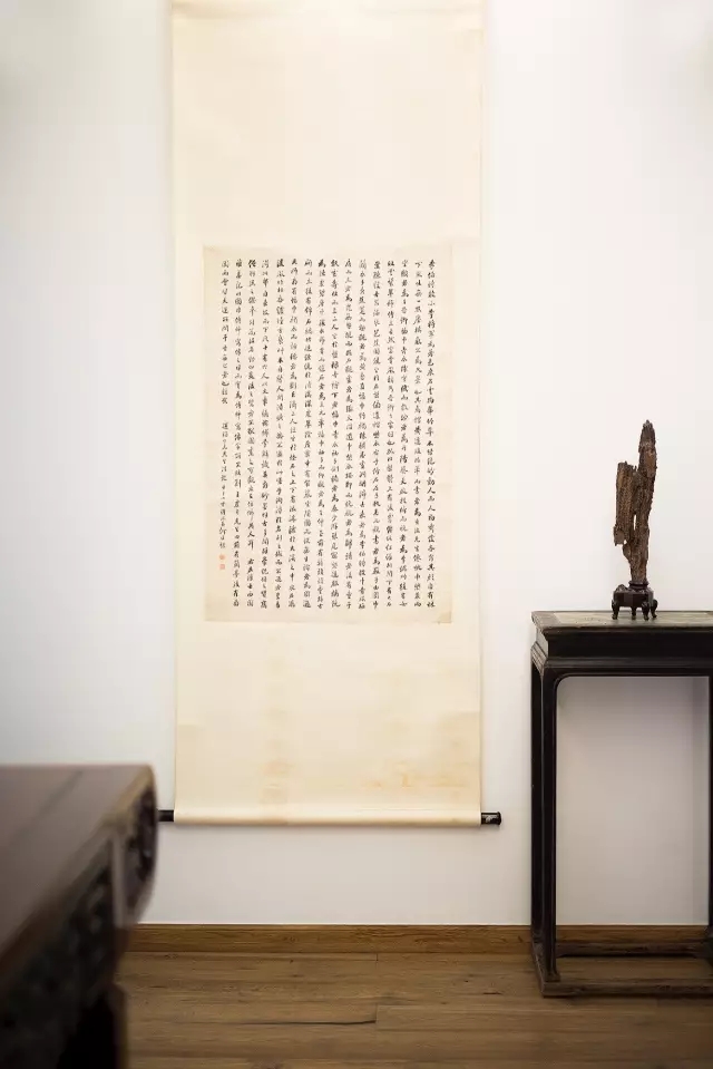 字画的悬挂与采光有着密切的联系,应将字画挂在采光好而又开阔的墙面,如床边、迎面墙、书桌、茶几和沙发等低矮家具上方,而不宜挂在角落阴影或高大家具旁。