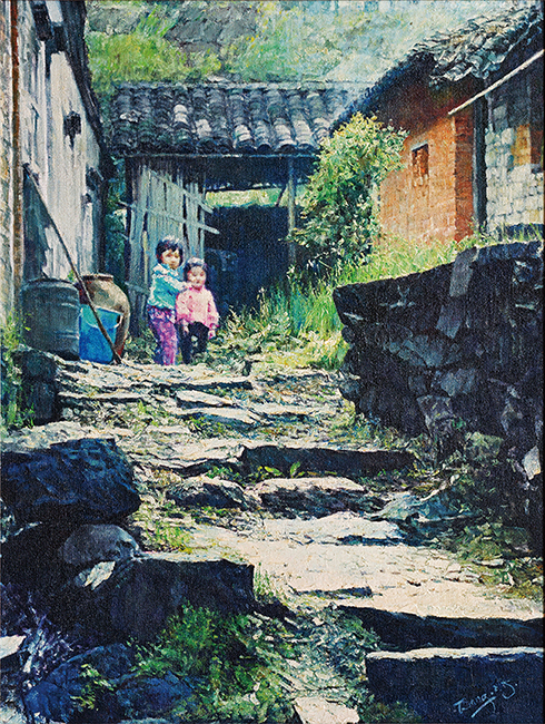 明媚的晨光照在山上,给山间带来了一种明亮的暖色。山景变得不再枯萎,不再遭受重创。山里云树重重,草木葱郁。路上的石板虽然还是从前的模样,却显得错落有致,洒满阳光。而最明显的,把我们的视线一下子就吸引过去的,也是这画面的视觉焦点——两个天真无睱可爱的小女孩相依相偎,她们让山活了起来,让整幅画活了起来。她们是金华山里金华:朴实,童真。她们的童年在温暖的阳光下,无比灿烂。两姐妹笑容可掬,无忧无虑。是的,她们不必再担惊受怕了 。她们的童年,与汪志杰的童年,有着天壤之别。