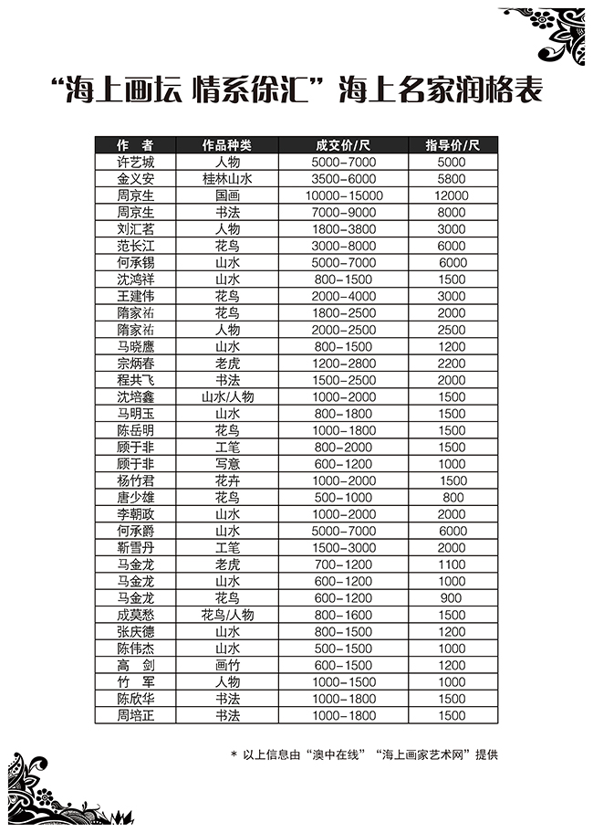 第六届“海上画坛·情系徐汇”画展暨笔会 润格表